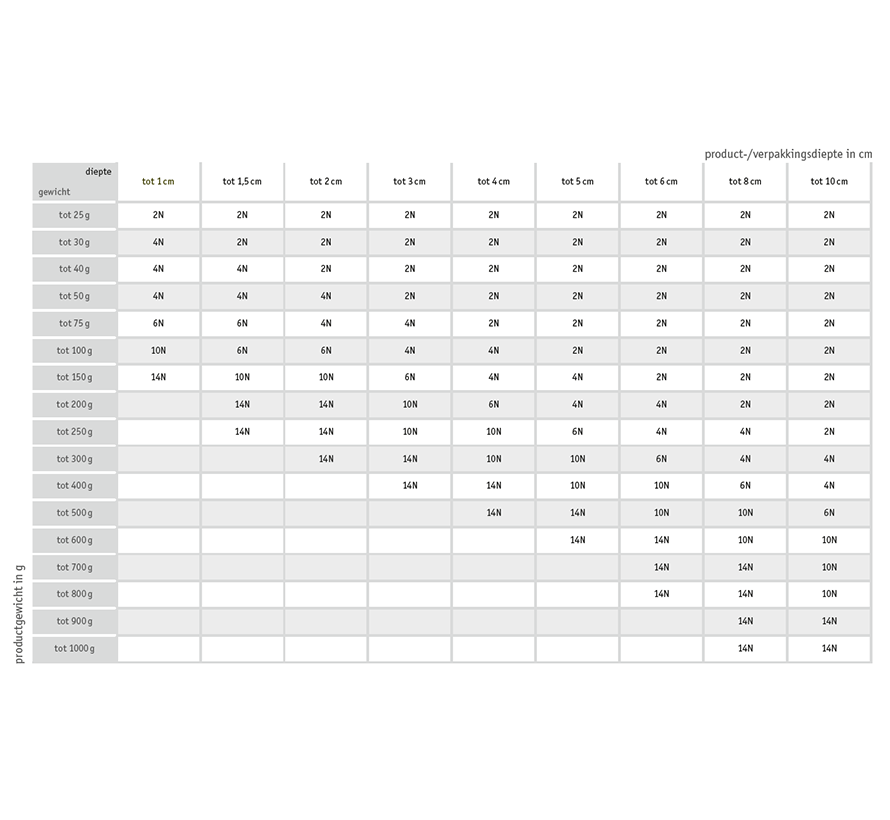 Zoek in de tabel de combinatie van gewicht (in gram) en verpakkingsdiepte (in cm).