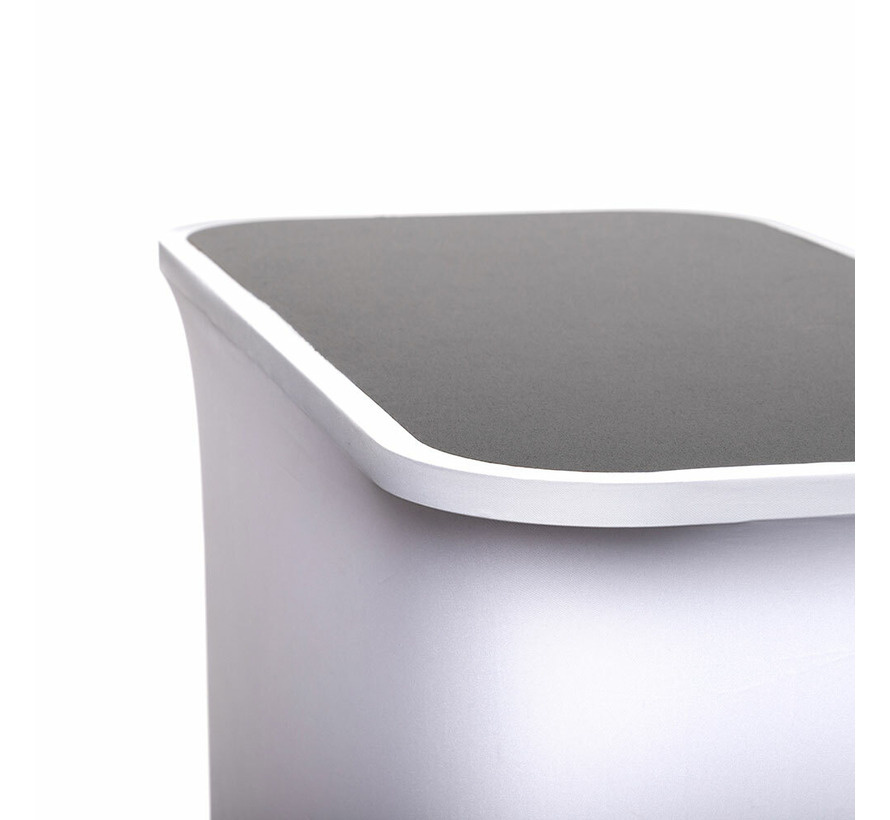 De Counter BounceUp van Shopdepot is een praktische en stijlvolle beursbalie die perfect inzetbaar is tijdens evenementen, beurzen of productpresentaties. Deze vrijstaande display is ontworpen voor snel gebruik en maximale visuele impact. Dankzij het slimme veersysteem is de balie binnen enkele seconden op te zetten. De balie wordt geleverd met een zwart tafelblad. Neem contact met ons op voor een textielprint met siliconen pees, eenvoudig te bevestigen met een ritssluiting aan de achterkant. De print is gemaakt van Lumina Sublimation 190 g/m², een hoogwaardige, brandvertragende polyester stof met uitstekende lichtdiffusie — ideaal voor gebruik op beurzen en in andere professionele omgevingen.