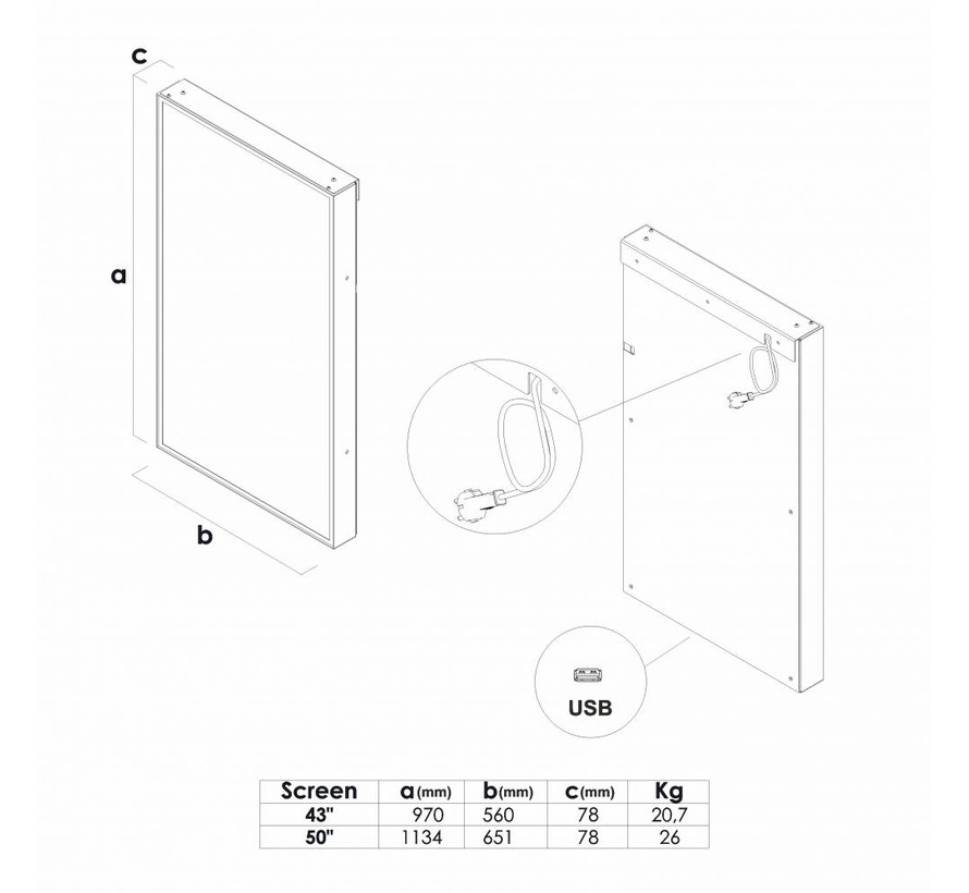 Het paneel kan eenvoudig met schroeven aan de muur worden bevestigd of, met de optionele ophangset, aan het plafond worden gemonteerd. Voor optimale warmteregeling is het ontwerp uitgevoerd zonder voorpaneel en wordt het standaard in staande opstelling geleverd. Dankzij Plug & Play, afstandsbediening of WiFi is het mogelijk om de getoonde video’s en afbeeldingen snel te personaliseren. Shopdepot biedt dit digitale paneel in zwart en wit, en op aanvraag kunnen ook andere RAL-kleuren worden geproduceerd.
