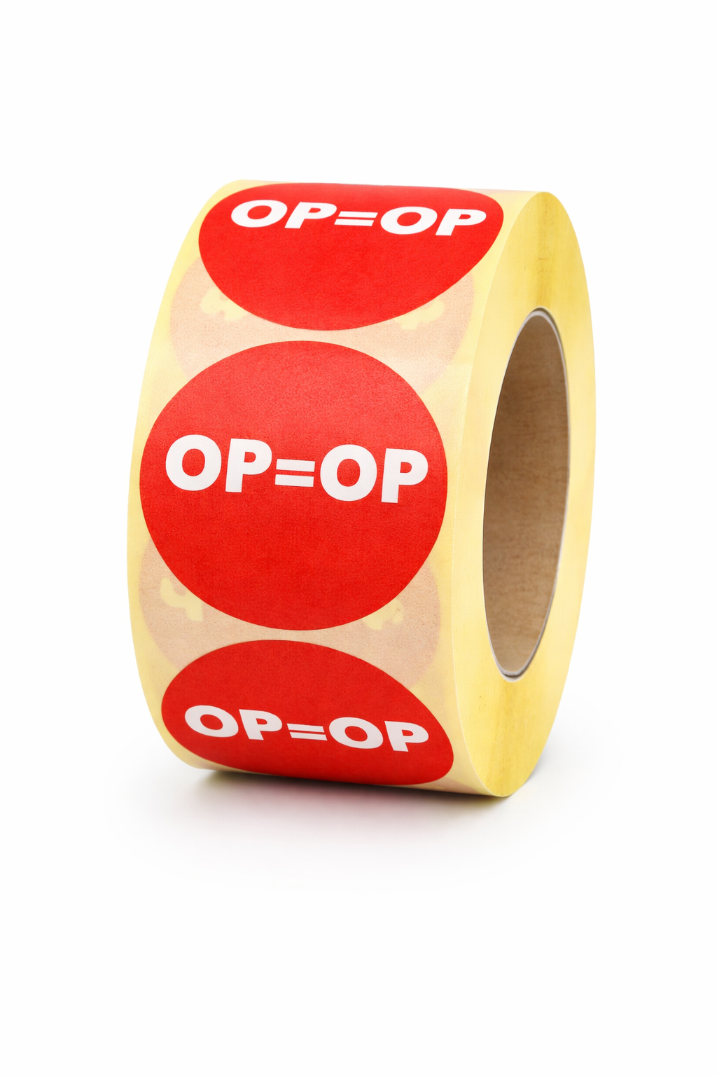 Ronde sticker met opdruk OP = OP in de kleur rood. De stickers zijn voorzien van een witte opdruk en de diameter van de sticker is 32mm. 500 stickers per rol. De kortingsstickers hebben permanente belijming.