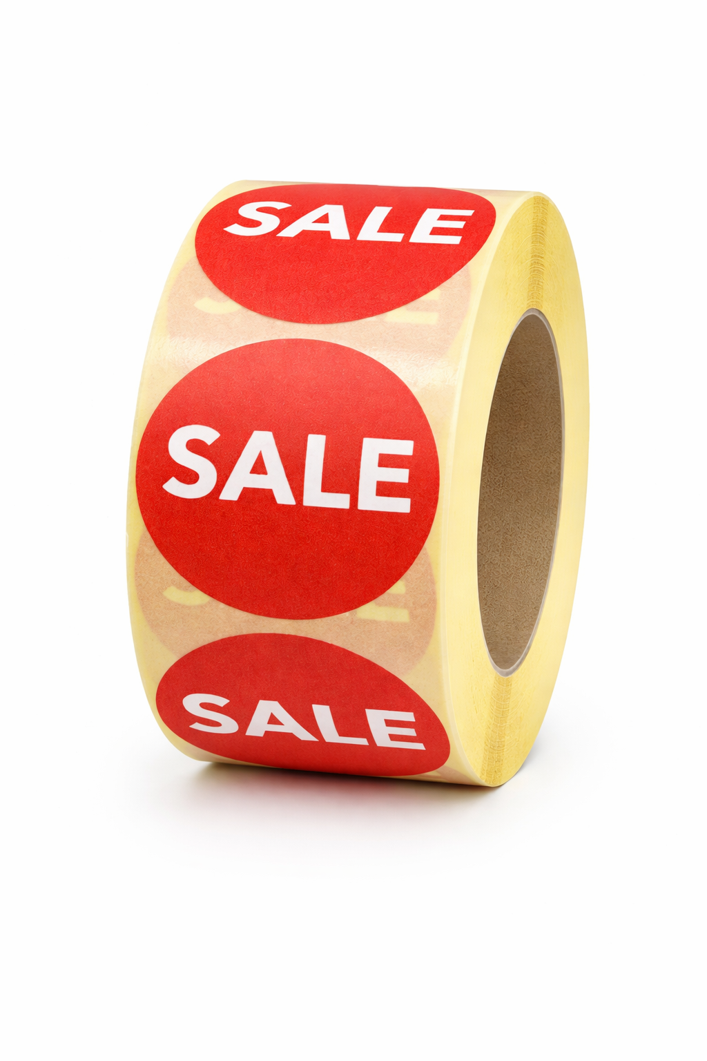 Ronde sticker met opdruk SALE in de kleur rood. De stickers zijn voorzien van een witte opdruk en de diameter van de sticker is 32mm. 500 stickers per rol. De kortingsstickers hebben permanente belijming.